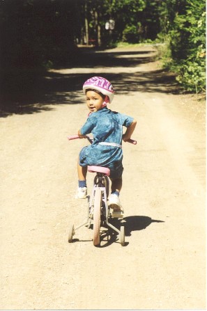 Katie Beth rides her bike through a forest of tall cedars at Camp Adanac.