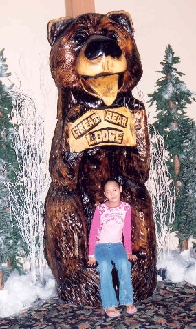 Ketie Beth poses on the lap of a big wooden bear at Great Bear Lodge.