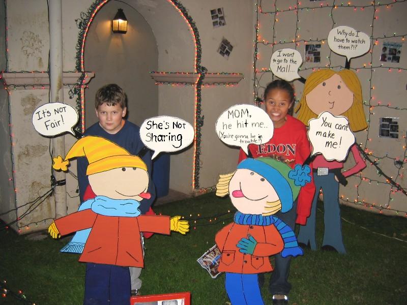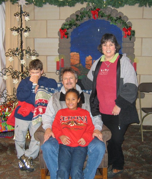 On Monday it rained, so Tom took the kids to the movies. We first saw Sponge Bob Square Pants, and then took in The Incredibles. On Tuesday morning, Tom took the kids to do arts and crafts with the resort staff artist. The kids painted little totem poles. The rest of the week was spent being tourists. We went to Slide Rock State Park, Airport Mesa, Sinagua Mall, and the Outlet Mall. We went out to eat with Greg's family at Steak-n-Stix restaurant. We also took the tour of the Christmas Lights at the Los Abrogados resort.